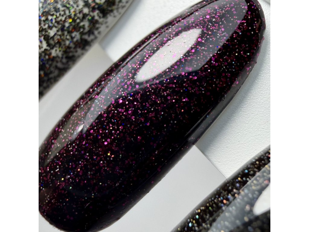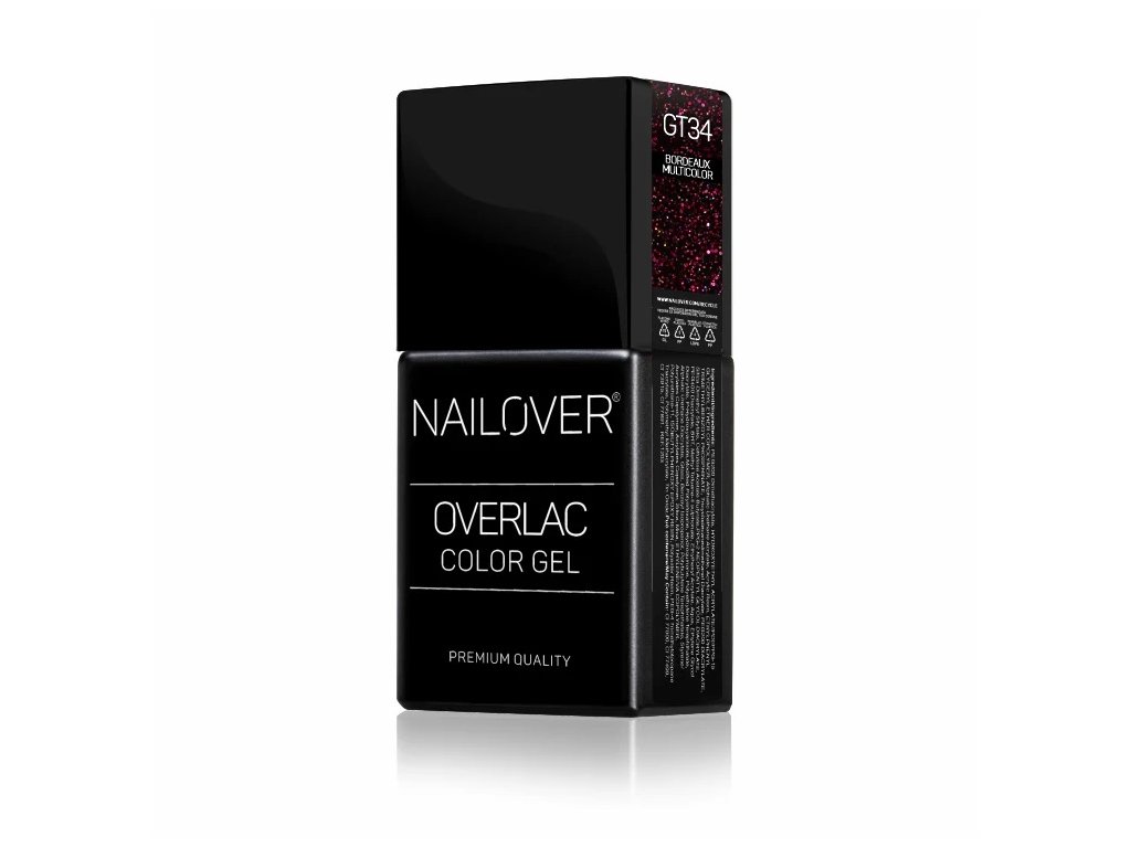 GT34 je sofistikovaný černý až bordeaux Overlac pro klientky, které chtějí něco jiného. Teplý, temný odstín je jemně prosvětlený multicolor mikroglittery, které barvu neruší, ale naopak ji zvýrazňují a dodávají jí živost a hloubku.